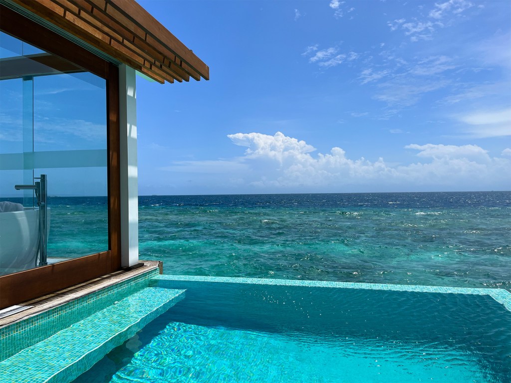 Ocean pool villa 210 is the second last villa on the jetty. 210 and 211 has a bit less lagoon colours in front of it, but on the other hand the reef drop off was much closer, which is important to us.