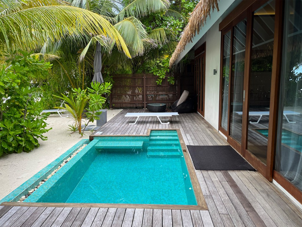 The pool villas had the nicest outdoor space amongst the beach villas, and the decking is very large, as they have an L-shape and covering two sides of the villa, so they are very nice if you want to get out of the sun or to be covered during rain when sitting outside. They are also the most private villas, and on the quietest side of the island. The pool is not very big (9 sqm) but we were fine about that.