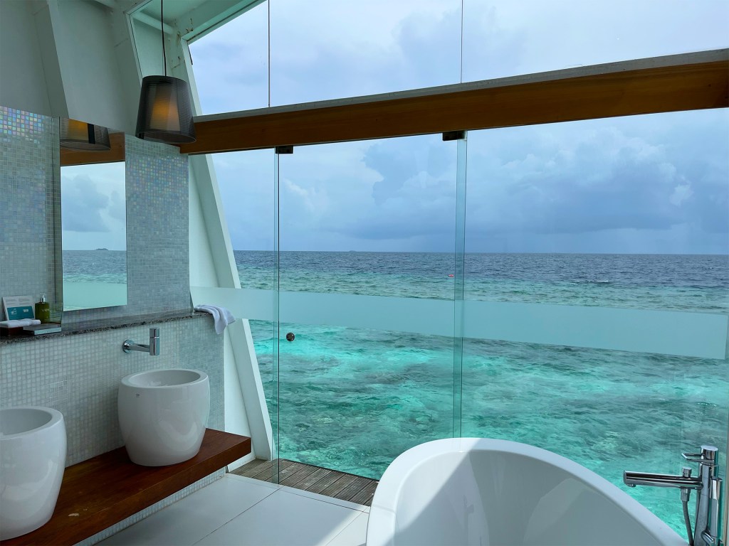 For the second half of the holiday, we stayed in ocean pool villa 210, which we loved. The bathroom, while not very large for being a 5-star resort (by Maldivian standards), was truly magical. Two of the walls are all glass panels that go all the way up to the very high ceiling. They do become quite hot when the sun is out, but there were large sliding doors on three sides which lets a nice breeze go through the bathroom.